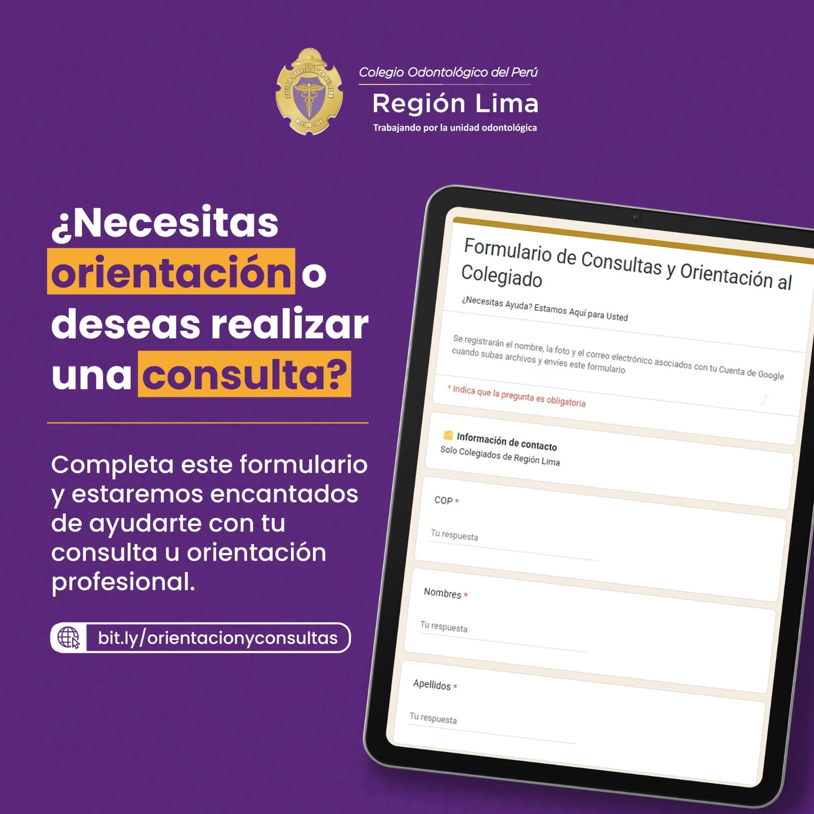 Si perteneces al Colegio Odontológico de Lima, estas al día con tu habilitación y necesitas orientación profesional, ahora contamos con el formulario de orientación y consultas.